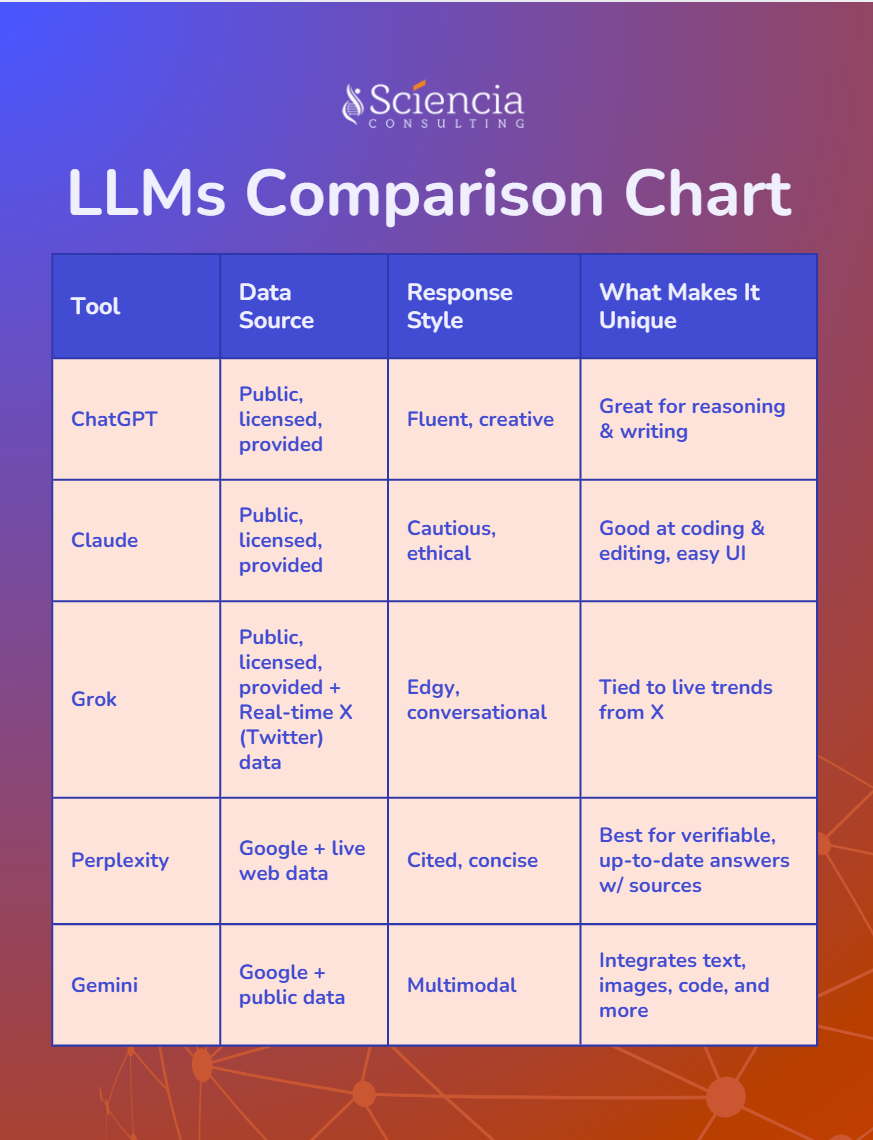 We performed a comparison of five significant LLM-driven AI co-pilots: ChatGPT (OpenAI), Claude (Anthropic), Gemini (Google DeepMind), Perplexity, and Grok (xAI). We learned about how the tools were developed and examined the strengths and weaknesses of each model within science communication tasks, writing tasks, and project implementation. Each AI tool’s different responses to the prompts were given a rating out of 5 in how effective they were at performing activities such as researching, creating diagrams, outlining, and handling timelines.